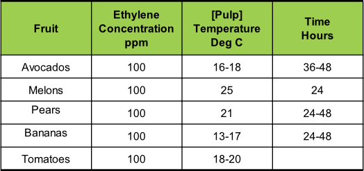 For example, a ripening room with a volume of 30m3 would require 2.5 x 30 = 75 grams of Ripegas to achieve a concentration of 100ppm ethylene.